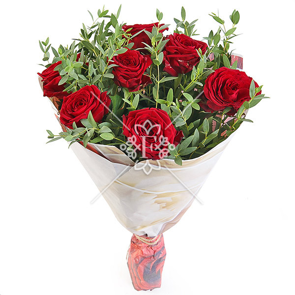 Роза красная - 7 шт., зелень декоративная, упаковка, лента.